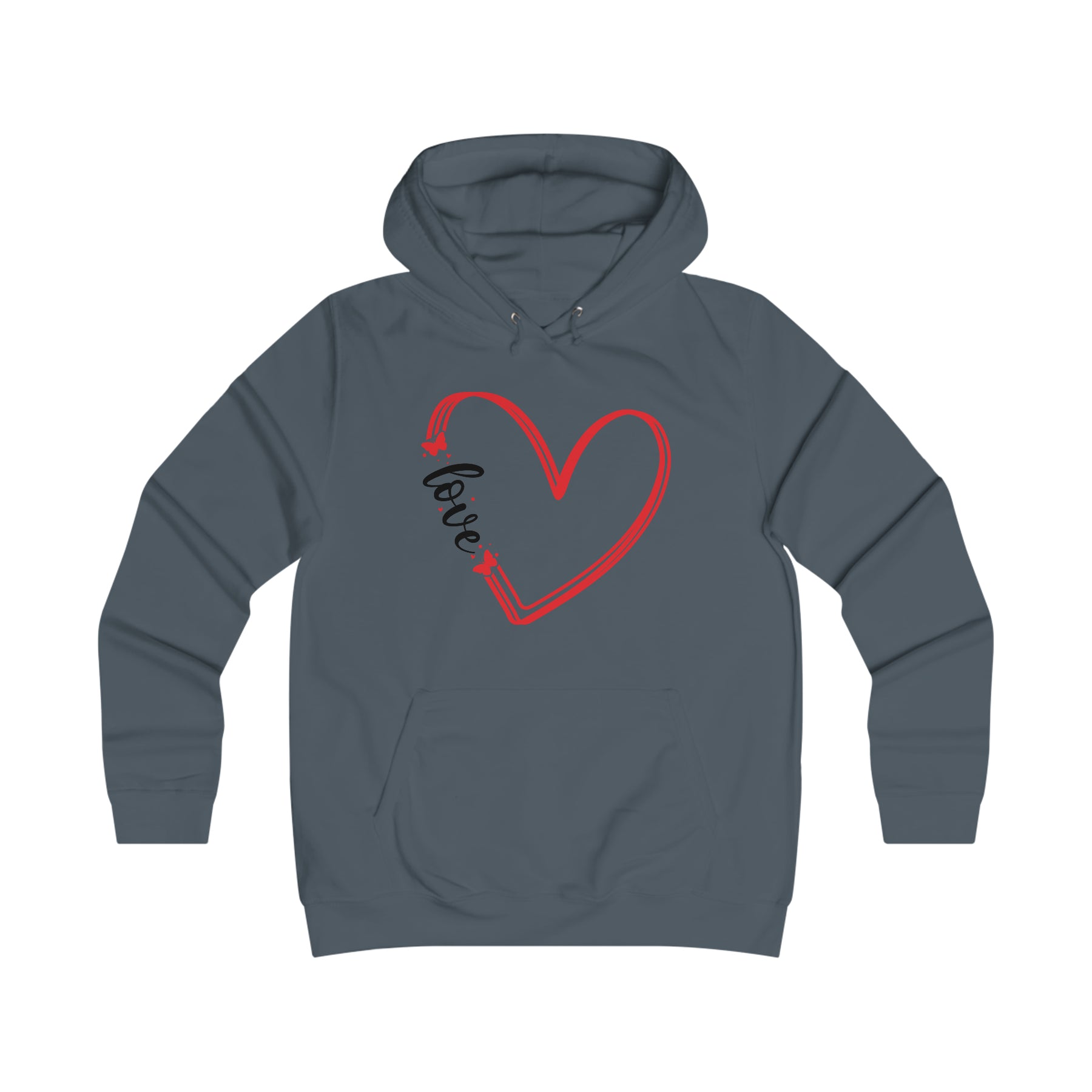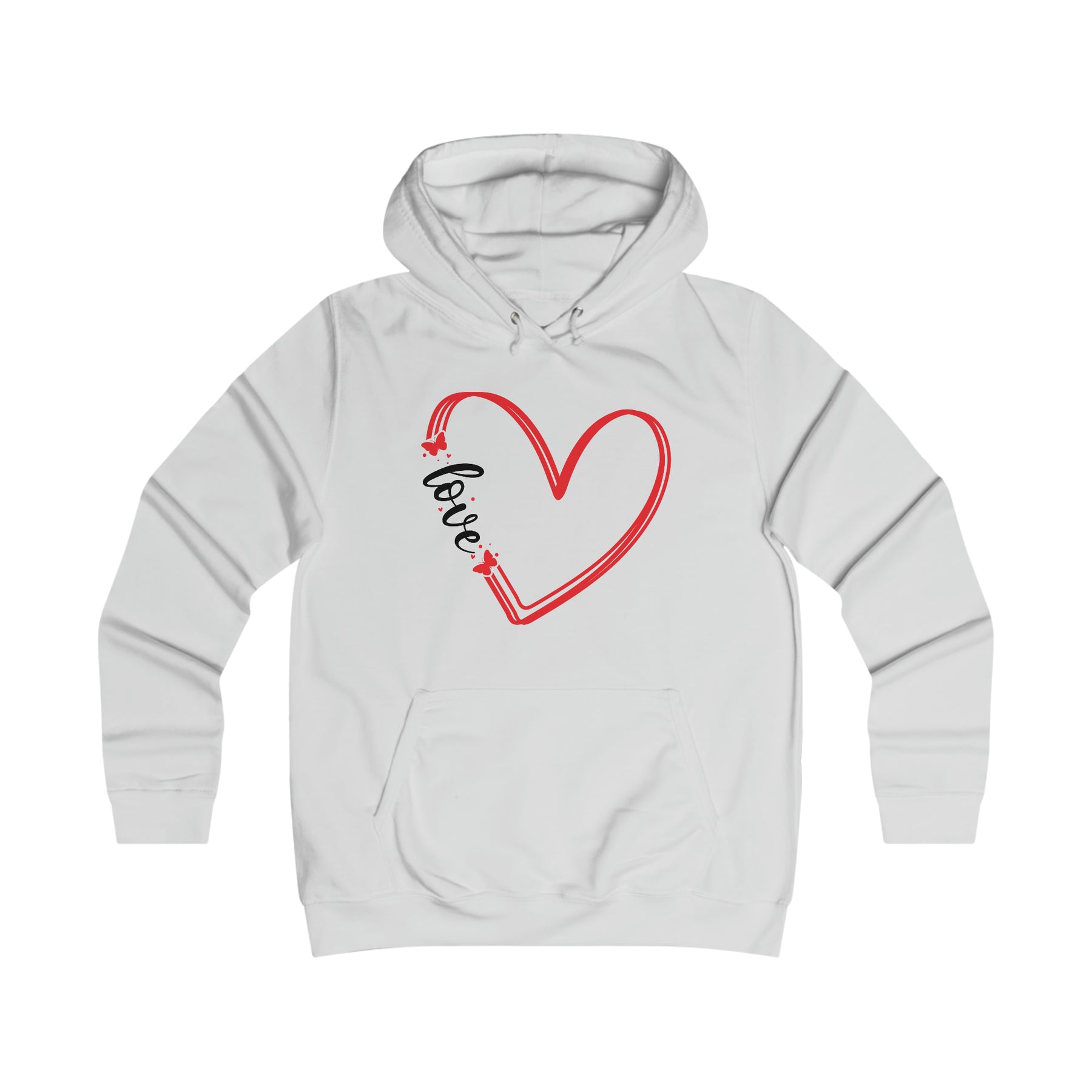 Ladies version of the popular JH001 hoodie. This College Hoodie has a feminine fit and features a double fabric hood, Kangaroo pouch pocket with a small hidden opening for headphone cord feed, ribbed cuffs and hem, self-colored drawstring cords and twin needle stitch detailing.