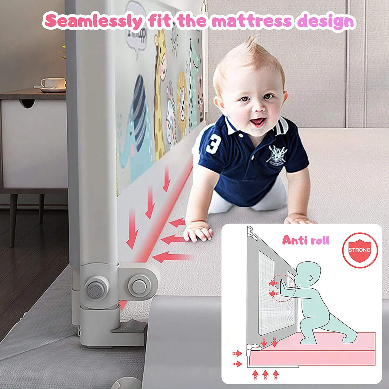 LapEasy The new upgraded bed guardrail is not only easy to use, safe and firm, but also adds the cute graphics that babies love.The new upgraded bed guardrail, adjustable pressure bed type design, tight pressure on a variety of thickness of the mattress, to prevent baby naughty drill holes, to bring peace of mind to the family good sleep.